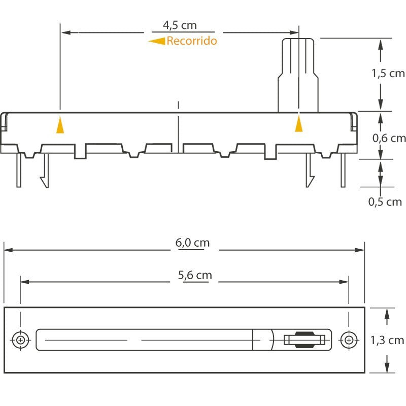 Potenciómetro deslizante con una resistencia nominal de 10 kOhms y una curva de respuesta lineal (Taper B). Cuenta con una longitud de cuerpo total de 60 mm y un ancho de 9 mm, con un recorrido de deslizamiento de 45 mm. Está diseñado con terminales de soldadura para montaje en placa de circuito impreso (PCB) y es apto para el control de señal en equipos de audio e iluminación.