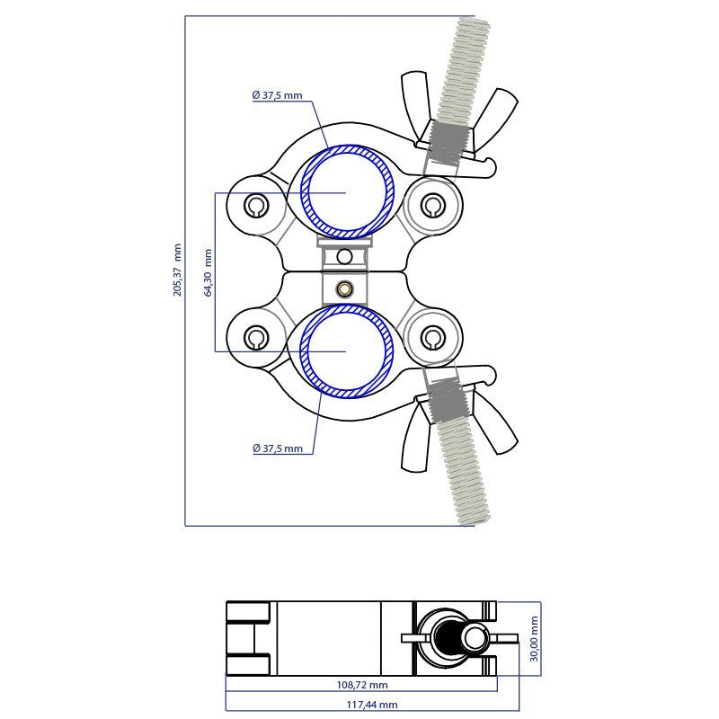 La abrazadera doble giratoria de Triton Blue es una solución de rigging profesional, diseñada para ofrecer la máxima fiabilidad y versatilidad en el montaje de estructuras y equipos. Fabricada en aluminio de alta resistencia y con un elegante acabado en color plata, esta abrazadera es un componente esencial para técnicos y empresas del sector del espectáculo, garantizando una sujeción segura y duradera en las condiciones más exigentes. Su diseño inteligente permite conectar tubos y equipos con una flexibilidad sin precedentes, gracias a su capacidad de rotación completa de 360°.
