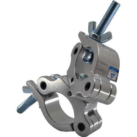 Abrazadera doble giratoria fabricada en aluminio con acabado en color plata. Diseñada para sujeción en tubos con diámetros comprendidos entre 38 mm y 52 mm. Presenta un ancho de 30 mm y una capacidad de carga máxima de trabajo (SWL) de 300 kg. Incorpora un mecanismo de rotación completa de 360° para un posicionamiento versátil y cuenta con certificación de seguridad TÜV.