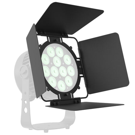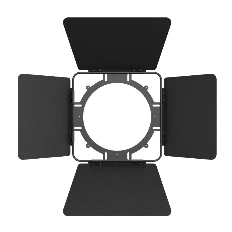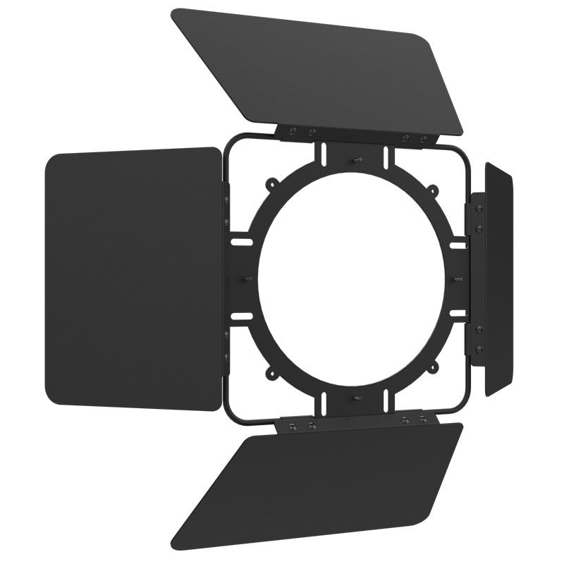 Una visera de 4 palas, o barndoor, es un accesorio que se monta en la parte frontal de un proyector para controlar la forma y la dirección del haz de luz. Cada pala se puede mover de forma independiente para recortar el haz y evitar que la luz se derrame en áreas no deseadas.
