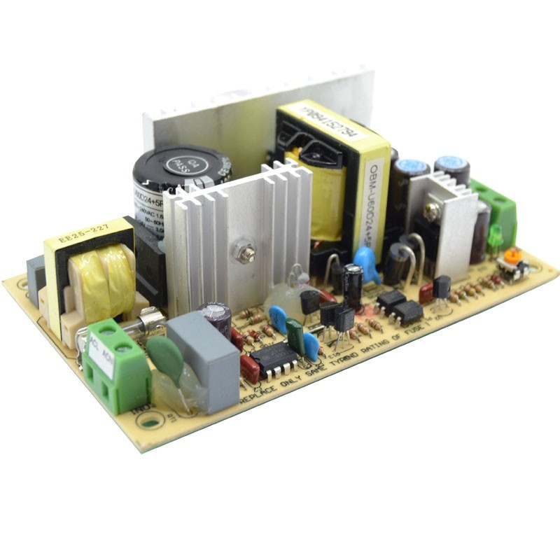 Fuente de alimentación conmutada de marco abierto, modelo OBM-U60D24+5R. Presenta una entrada de voltaje universal de 100-240V AC. Ofrece una salida dual de corriente continua: una salida de 24V a 3A y una segunda salida de 5V a 1A. Incorpora protecciones integradas contra sobretensión (OVP), sobrecorriente (OCP) y cortocircuito (SCP). Sus dimensiones son 128 x 77 x 42 mm y tiene un peso de 250 g.