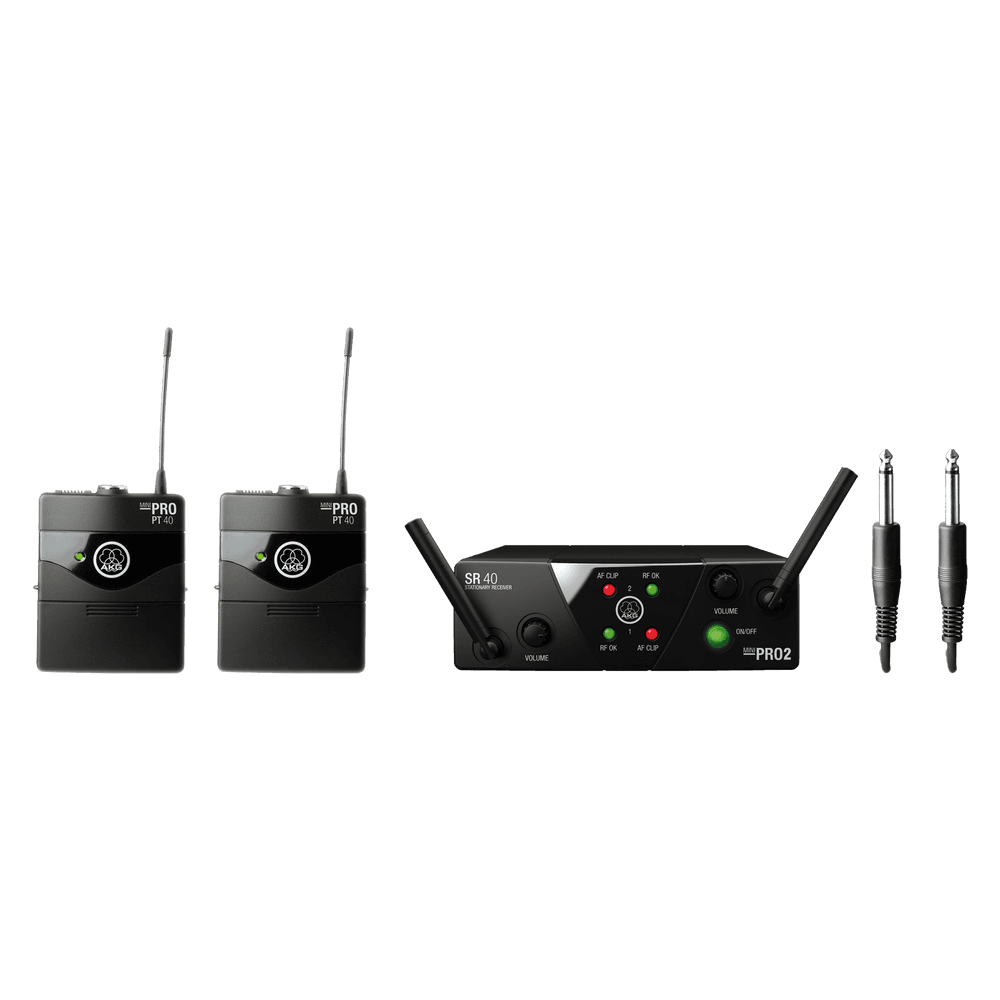 Sistema inalámbrico UHF dual para instrumento AKG WMS40 Mini2 Band ISM2/3; receptor SR40 Mini2 Dual con 2 salidas jack 6,35 mm TRS balanceadas, indicadores Power/RF OK/AF CLIP y control de volumen por salida; transmisores 2× PT40 Mini (mini XLR 3 pines, ganancia ajustable) con autonomía hasta 30 h (1×AA); frecuencias fijas 864,375 MHz (ISM2) y 864,850 MHz (ISM3); incluye 2× MKG L y fuente SMPS 110–240 V con adaptadores.