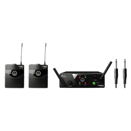 El AKG WMS40M2INSTBDISM2-3 es el set dual de la serie WMS40 Mini para instrumento, configurado en Banda ISM2/3 (863–865 MHz) con dos enlaces independientes en 864,375 MHz (ISM2) y 864,850 MHz (ISM3). Incluye el receptor SR40 Mini2 Dual, dos petacas PT40 Mini y dos cables MKG L (jack 6,35 mm a mini XLR de 3 pines) para conectar guitarras, bajos, teclados o pastillas de instrumento. Es una solución plug & play con tecnología HDAP que prioriza la inteligibilidad y estabilidad, y ofrece una autonomía extraordinaria de hasta 30 horas por transmisor con una única pila AA.