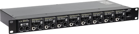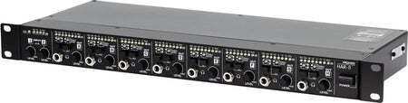 Amplificador de auriculares rackeable de 8 canales, con entradas balanceadas y jack TRS, vúmetros LED, controles independientes de nivel y fuente, chasis de 1U negro de alta resistencia (483×44,5×170 mm, 2,72 kg).