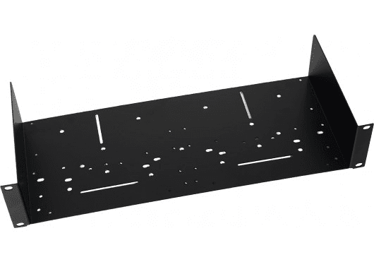 Bandeja rackable 2U en acero negro, 482×350×89 mm, carga 20 kg, tornillería estándar incluida.