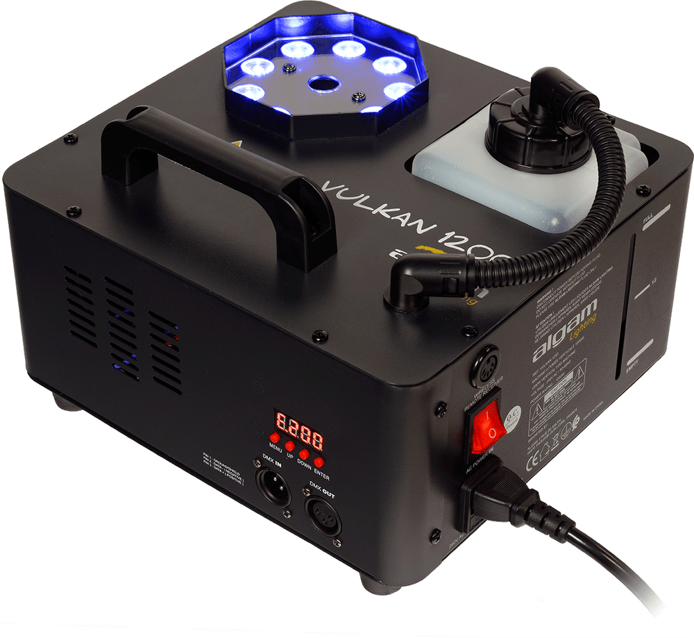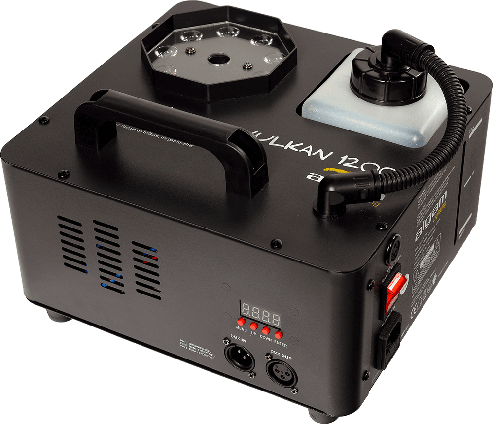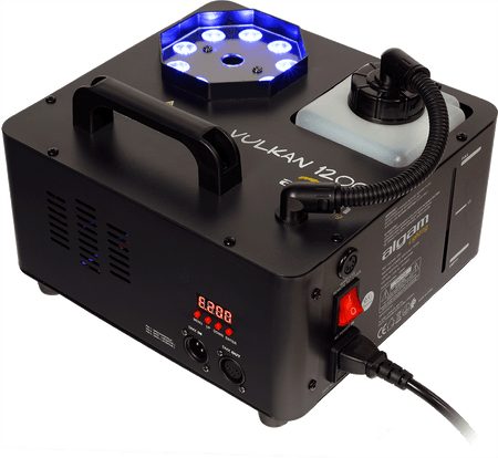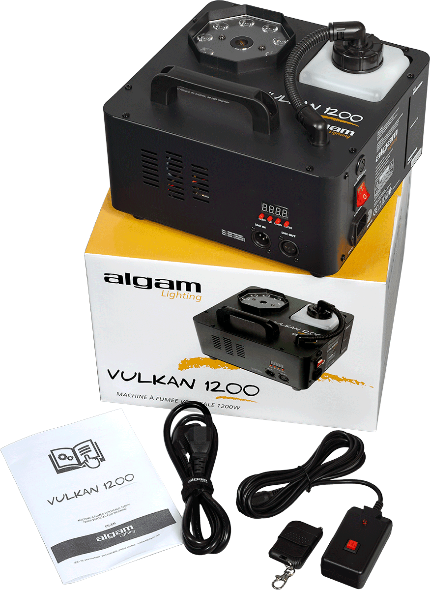 La Algam VULKAN1200 es la máquina de humo estilo CO₂ más compacta de Algam Lighting, diseñada para generar potentes chorros verticales de humo de hasta 5 m de altura. Gracias a su núcleo calefactor de 1 200 W, alcanza temperatura óptima en 3–5 min y ofrece un caudal de 226 m³/min, ideal para resaltar efectos de iluminación con sus 9 LEDs RGB integrados. Su depósito de 1,2 L, ventana de nivel visible y modos Manual, HF remoto o DMX de 7 canales permiten un control preciso desde consola o a distancia.