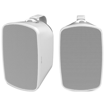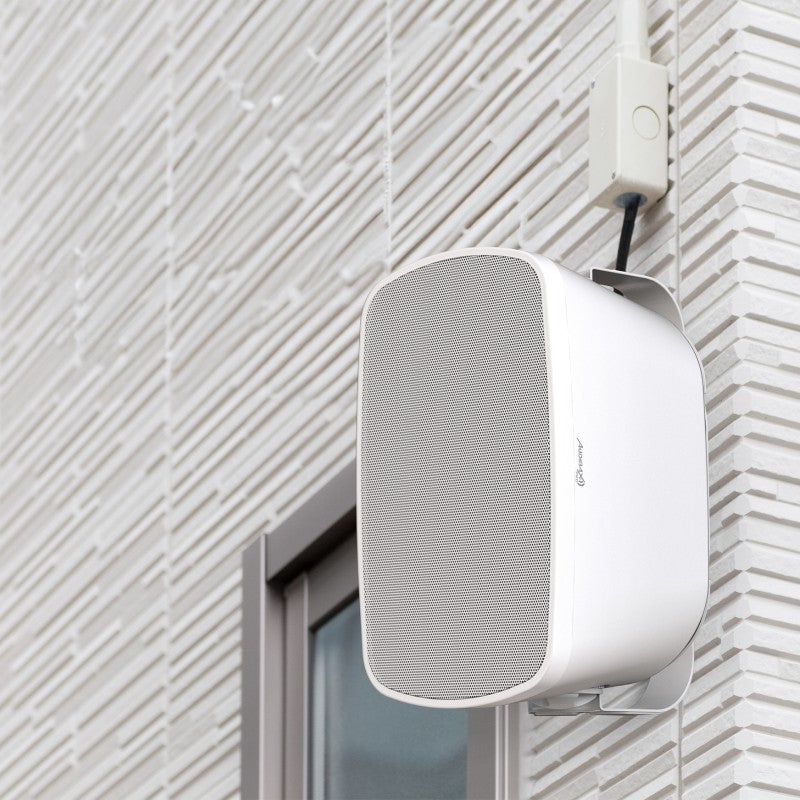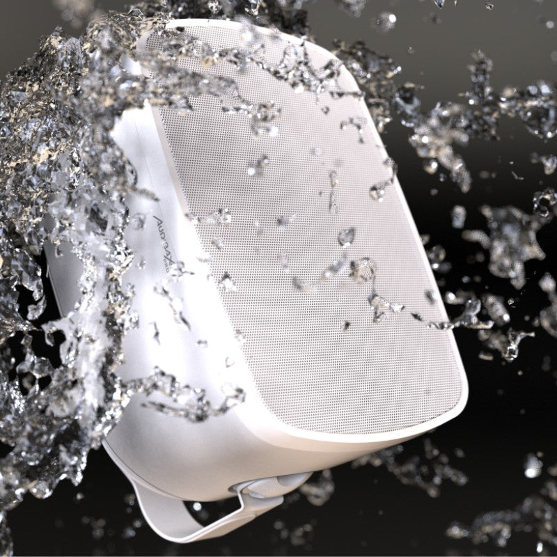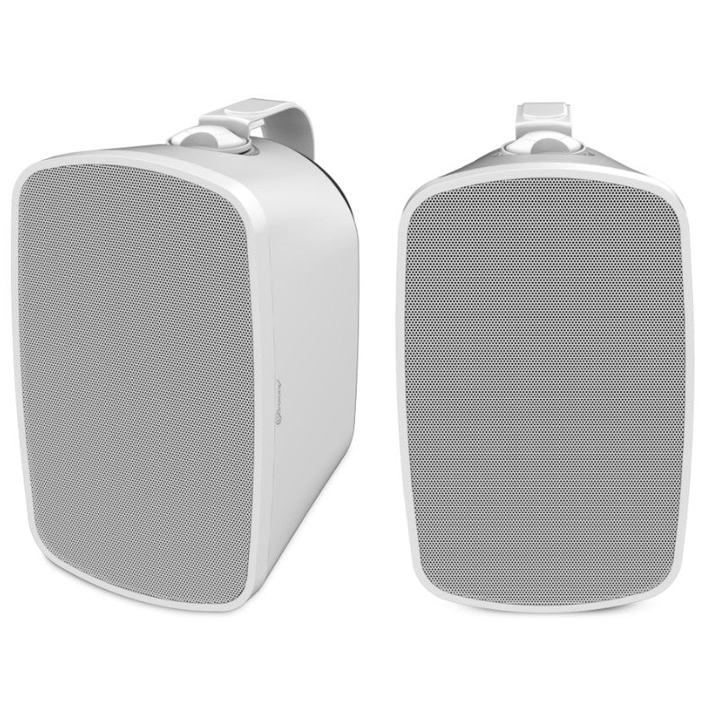 Pareja de altavoces pasivos de pared IP65 (recinto ABS); LF 5″ (cono de grafito, borde de goma) + HF 1″ (cúpula de seda); 57 Hz–20 kHz; 85 dB; 20 W RMS (40 W program); taps 20/10/5/2,5 W en 100V/70V y modo 8 Ω; Euroblock; incluye 2 soportes; dimensiones por unidad 258 × 168 × 163 mm; peso por unidad 3,5 kg; color blanco.