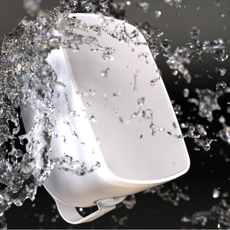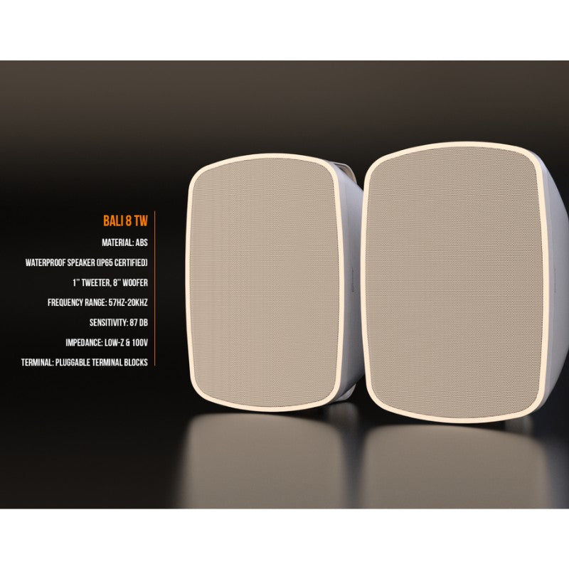Pareja de altavoces pasivos de pared IP65 (recinto ABS); LF 8″ (cono de grafito) + HF 1″ (cúpula de seda); 57 Hz–20 kHz, 90 dB; 50 W RMS; taps 100V 6,25/12,5/25/50 W y 70V 2,5/5/10/20 W; modo 8 Ω; Euroblock; 2 soportes incluidos; dimensiones por unidad 381 × 250 × 250 mm; peso por unidad 5,02 kg; color blanco.