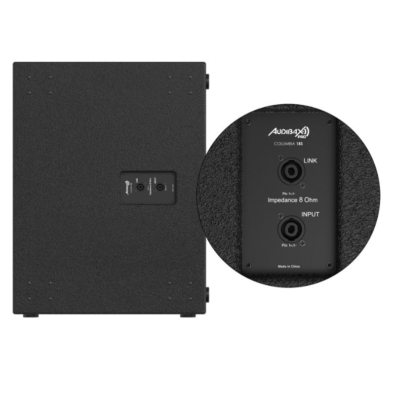 Subwoofer pasivo Audibax Pro Columbia 18S con woofer 18" (VC 3"), 800 W RMS / 1600 W pico, 97 dB (1 W/1 m), SPL máx. 129 dB, 35–120 Hz, 8 Ω; conectividad Speakon NL4 (entrada) con enlaces; zócalo 36 mm para poste; recinto plywood, IP50; dimensiones 65 × 59 × 50 cm (L × A × H); 32 kg. Incluye manual.