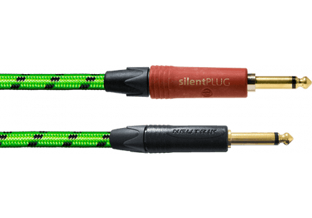 Cable de instrumento de 3 metros de longitud con funda textil de color verde reactiva a la luz UV. Utiliza cable a granel Cordial CGK 150 con una sección de conductor de cobre de 0.50 mm² (AWG 21). Presenta un doble apantallamiento mediante un blindaje trenzado de cobre y una capa de semiconductor de carbono. La capacitancia es de 88 pF/m y la resistencia del conductor es inferior a 39 Ω/km. Está terminado con dos conectores jack mono de 6.3 mm rectos marca Neutrik, siendo uno de ellos un modelo Neutrik silentPLUG para la conexión y desconexión silenciosa del instrumento.