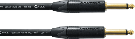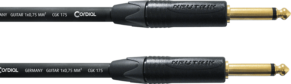 Cable de instrumento profesional de 9 metros de longitud. Equipado con dos conectores jack mono TS de 6.35 mm rectos marca Neutrik, modelo NP2X, con contactos bañados en oro. Utiliza cable Cordial CGK 175 con un área de conductor de 0.75 mm² compuesta por 42 hilos de cobre libre de oxígeno (OFC). Incorpora un sistema de doble blindaje con una pantalla de espiral de cobre y una capa de plástico conductor. La capacitancia es inferior a 88 pF/m y el diámetro exterior del cable es de 7.2 mm con cubierta de PVC.