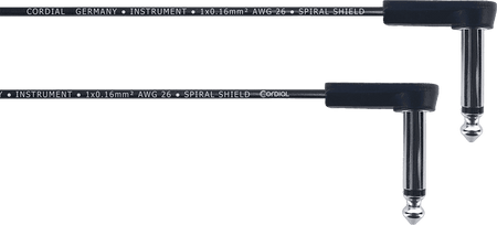 Latiguillo de interconexión para instrumentos, de 5 cm de longitud. Cable de perfil plano con dos conectores jack TS mono macho de 6.3 mm, acodados y de diseño "pancake" de bajo perfil. Conductor con sección de 0.16 mm² y construcción de 20 x 0.10 mm. Incorpora doble apantallamiento mediante espiral de cobre y plástico conductor. Cubierta exterior de PVC flexible y resistente.