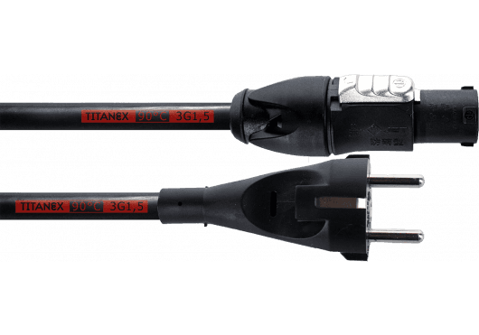 Cable de alimentación profesional de 1,5 metros de longitud. Equipado con conector macho Schuko CEE 7/7 y conector hembra Neutrik NAC3FX-W-TOP (powerCON TRUE1). Cable de goma tipo Titanex® H07RN-F con una sección de conductor de 3 x 1.5 mm². Capacidad de corriente de 16 A a 250 V. Grado de protección IP65 contra polvo y agua. Conforme a la norma IEC EN 60799:2021 y con certificación VDE. Incluye tubos termorretráctiles transparentes para identificación.