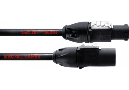 Cable de extensión de alimentación de 3 metros de longitud. Equipado con conectores Neutrik powerCON TRUE1 TOP (entrada/salida) con capacidad de conexión y desconexión bajo carga. El cable es del tipo Titanex H07RN-F con una composición de 3 conductores de 1,5 mm² de sección cada uno. El conjunto de la conexión ofrece un grado de protección IP65 contra polvo y agua.