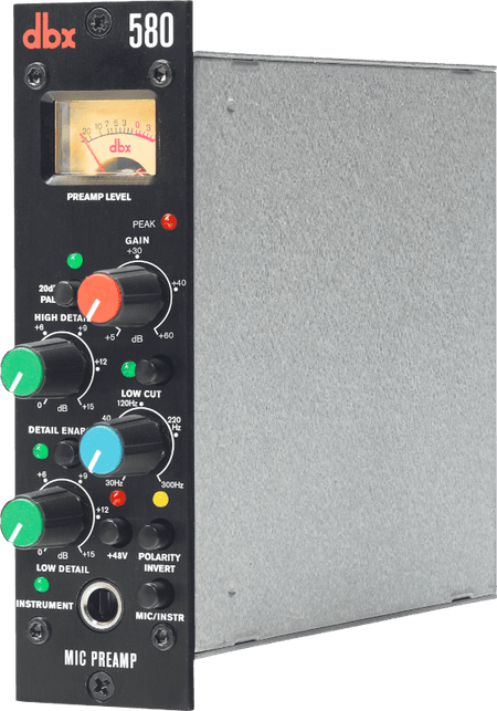 Preamplificador de micrófono dbx 580 para formato Serie 500 (1 ranura); ganancia máx. 60 dB; +48 V, pad −20 dB, inversión de polaridad, conmutación MIC/INSTR; filtro Low-Cut 30–300 Hz, 12 dB/oct (Bessel); controles Detail: Low (+15 dB a 125 Hz con recorte simultáneo a 400 Hz) y High (+15 dB con shelf a 10 kHz); entrada INSTR TS 1/4” 500 kΩ; salida balanceada; medición VU y LED de pico; alimentación del chasis ±16 V (80 mA/raíl, 2,56 W); rendimiento típico: EIN > −128 dBu, THD+N < 0,006 %, 20 Hz–20 kHz +0/−1 dB; dimensiones 13,34 × 3,81 × 15,24 cm; peso 0,59 kg.