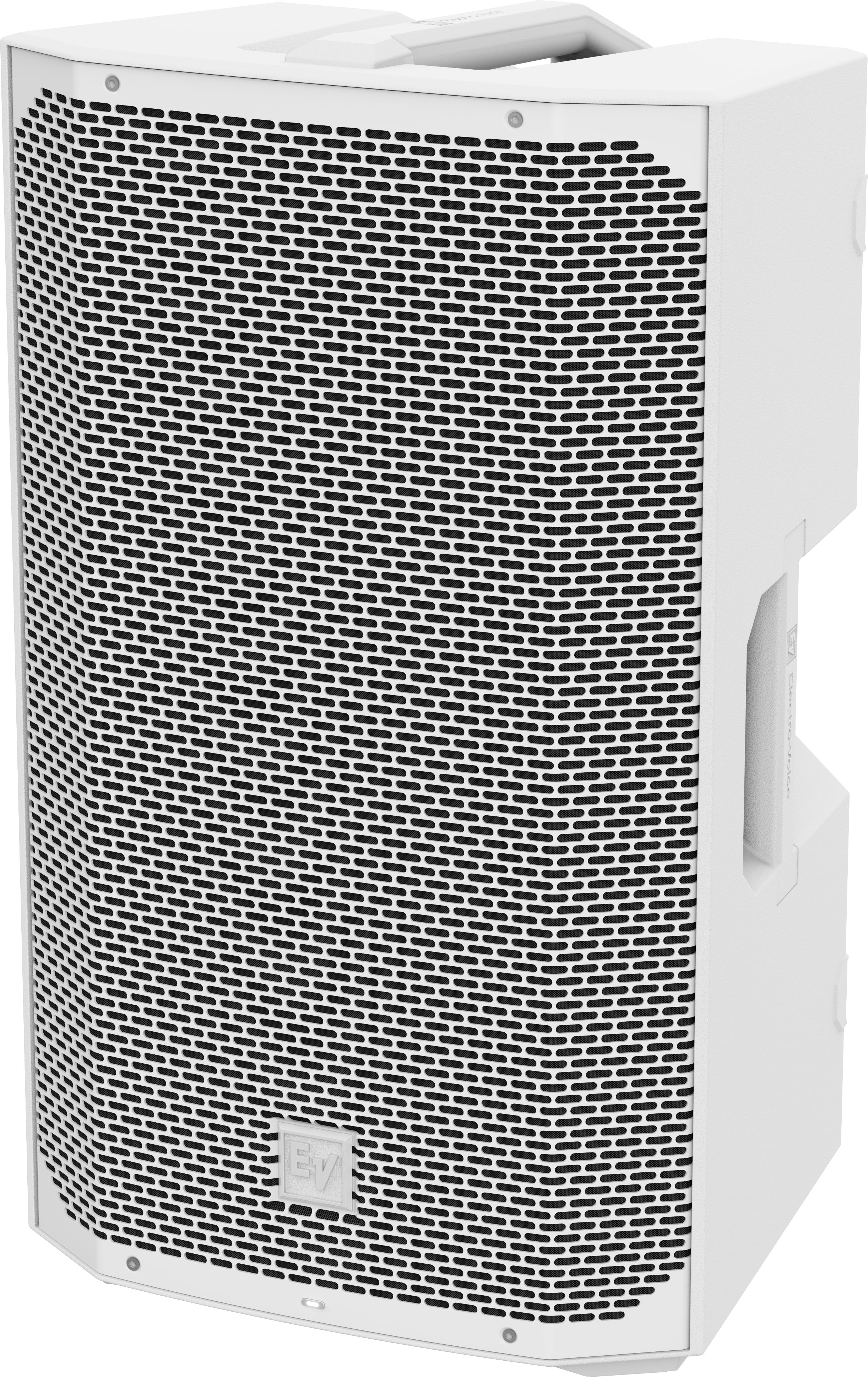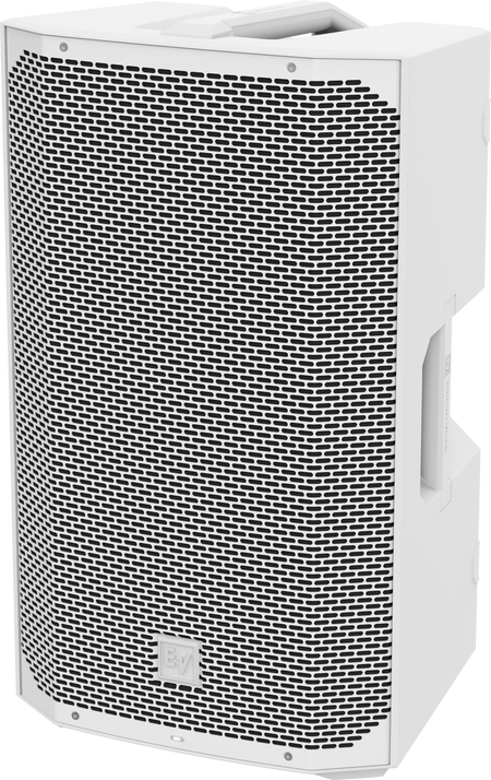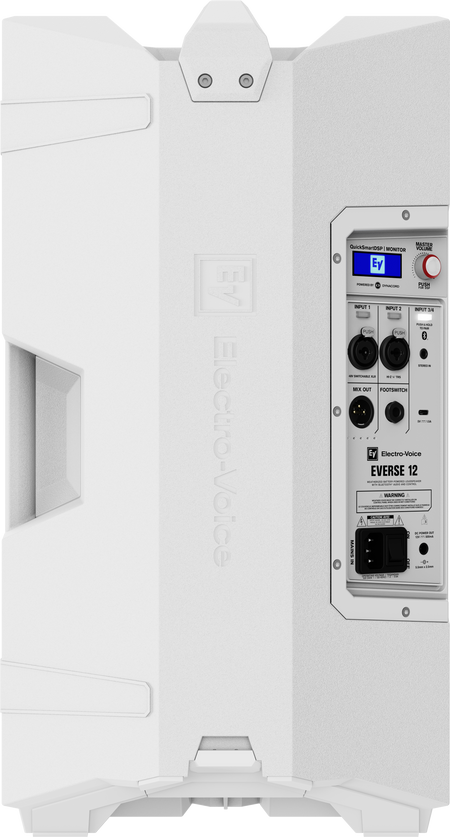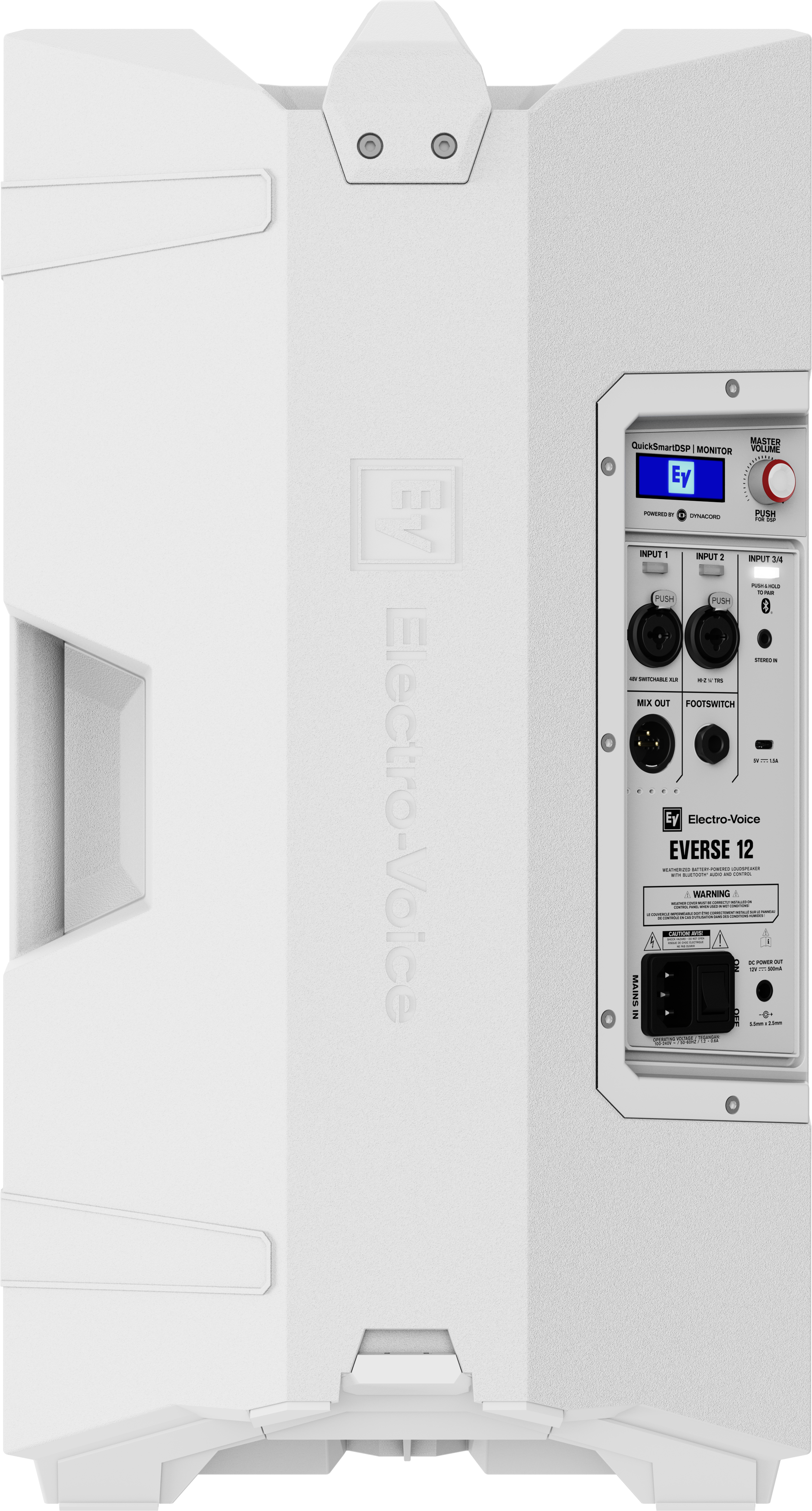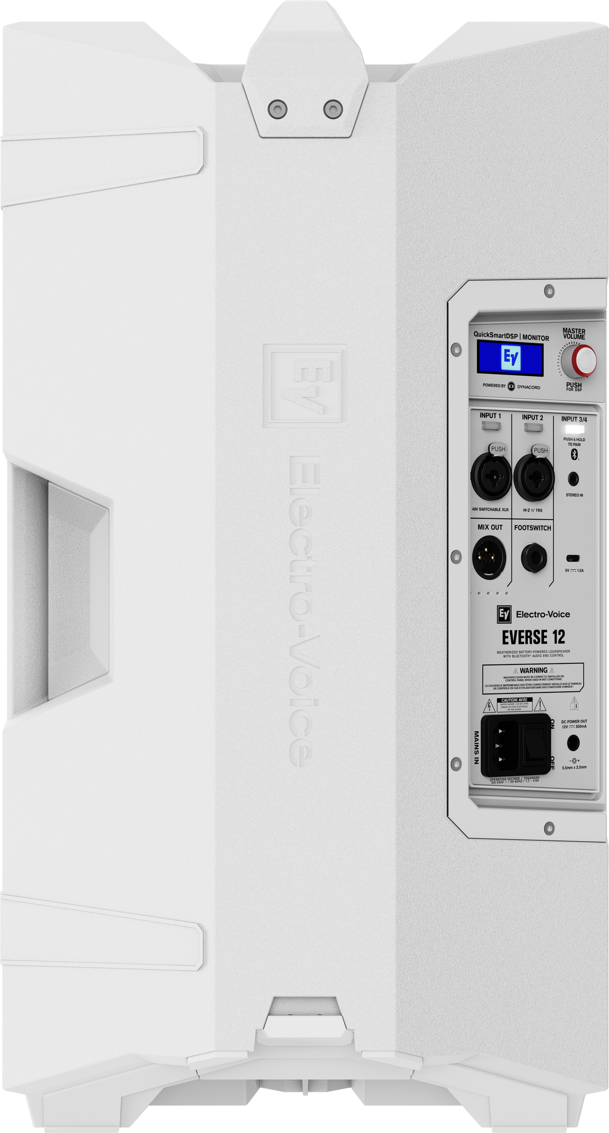 Altavoz PA autoamplificado a batería Electro-Voice EVERSE 12-W (blanco) de 2 vías: woofer 12″ (ferrita) + motor de compresión 1″ (neodimio); potencia pico 400 W, 126 dB SPL máx.; cobertura 100° × 60°; respuesta 55 Hz–20 kHz (rango 45 Hz–20 kHz). Mezcla digital de 4 canales con efectos, phantom +48 V, supresión de feedback y ducking. Conectividad: 2 × XLR/TRS, 3,5 mm, salida XLR, entrada de cargador, salida 12 V DC, USB-C (1,5 A máx.), entrada TRS para pedal. Weatherized IP43 con tapa instalada y uso a batería. Ángulos monitor/kick-back: 25°/55°. Dimensiones: 345 × 597 × 347 mm; peso: 14,16 kg; recinto de polipropileno y rejilla de acero.