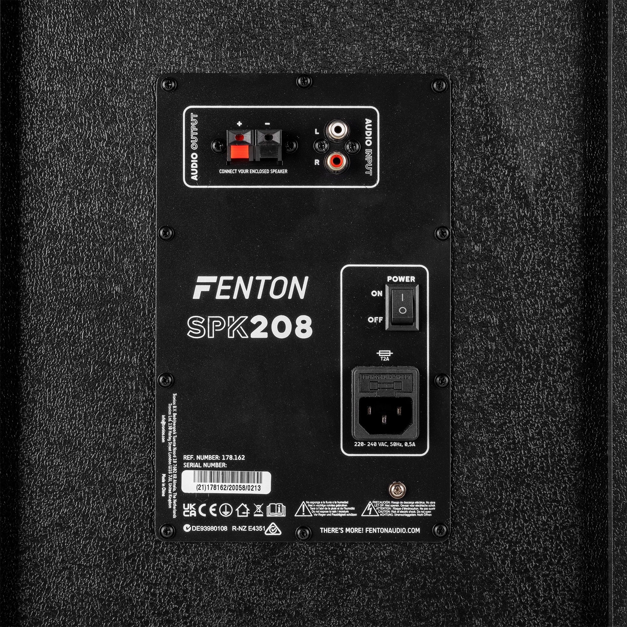 El Fenton SPK-208 es un sistema de megafonía activo estéreo compuesto por dos recintos acústicos tipo torre. Cada unidad incorpora dos woofers de 8 pulgadas (20 cm) y un tweeter piezoeléctrico para la reproducción de frecuencias medias y altas. El sistema ofrece una potencia máxima de salida de 800W e integra un amplificador en la unidad principal. Las opciones de conectividad incluyen receptor Bluetooth para streaming de audio, reproductor MP3 vía puertos USB/SD y entrada de línea RCA estéreo. Dispone de dos entradas de micrófono de 6.3mm con efecto de eco ajustable y ecualizador de dos bandas (graves y agudos). El recinto está construido en madera con acabado de moqueta acústica negra, esquinas reforzadas y asas de transporte laterales. Alimentación AC 220-240V.