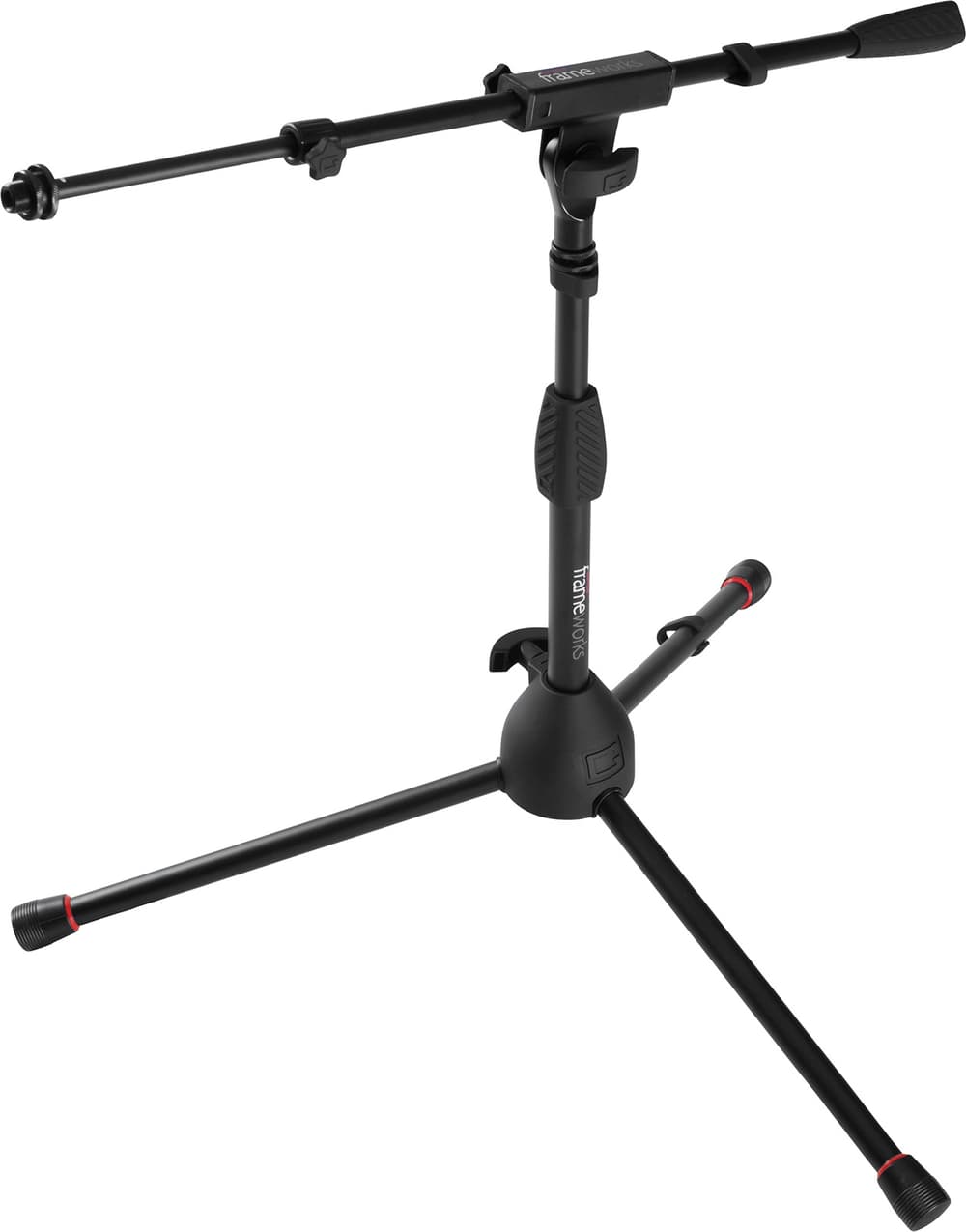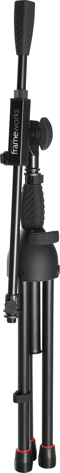 Soporte de micrófono de perfil bajo con base trípode plegable; altura regulable hasta 1066 mm; brazo telescópico con longitud máxima de 762 mm; construcción en acero; clips pasacables incluidos; compatibilidad con clips US y Euro; patas con ribete rojo desmontable; color negro.