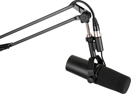 Brazo de micrófono de sobremesa con articulación por muelles, rosca 5/8"-27, cable XLR interno de 3,05 m, brazos de 52,5 cm (inferior) y 49,0 cm (superior), extensión máxima ~98 cm, rotación 360°, capacidad de carga recomendada 1,18 kg, montaje mediante abrazadera para tableros de hasta 55 mm e incluye kit de montaje de superficie; construcción en acero con recubrimiento en polvo negro; peso neto 1,63 kg.