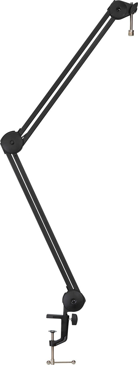 El Gator Frameworks GFW-MIC-BCBM2000 es un brazo articulado de micrófono diseñado para instalación en mesa que ofrece movimiento fluido y silencioso, gran rango de ajuste y una sujeción segura para sesiones de podcasting, locución, streaming y grabación. Su construcción en acero con recubrimiento en polvo y muelles metálicos de tensión garantiza estabilidad y durabilidad; el pomo en el extremo permite fijar con precisión el ángulo del micrófono. El sistema se ancla por abrazadera a tableros de hasta 55 mm de grosor y admite micrófonos de hasta 1,1 kg de peso, con rosca estándar 5/8"-27 para compatibilidad directa con la mayoría de pinzas y suspensiones (incluyendo modelos populares como Shure SM7B o MV7). Con un alcance máximo de 980 mm (38,6") y rotación de 360°, facilita un posicionamiento ergonómico sin invadir el espacio de trabajo.