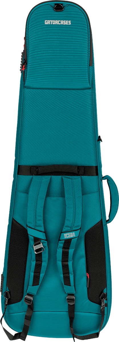 En el exterior, la G-ICONBASS-BLU propone un sistema de transporte muy completo: correas tipo mochila ocultables con abrebotellas integrado en una de sus hebillas, asas reforzadas y acolchadas en frontal, lateral y parte trasera, y topes de goma (rubber bumpers) en los puntos de apoyo para proteger la funda al dejarla en el suelo o apoyarla en paredes y escenarios. Las cremalleras principales del compartimento del bajo son compatibles con candados TSA, lo que facilita el paso por aeropuertos y controles de seguridad.