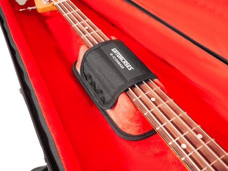 En su interior, la G-ICONBASS incorpora un forro de microterciopelo rojo (micro-velvet) extremadamente suave, que protege los acabados del bajo frente a arañazos y marcas. Dispone de bloques ajustables para mástil y cuerpo (neck & body blocks) que se fijan mediante velcro y permiten adaptar el soporte a diferentes formas de cuerpo y tipo de pala. Este sistema fija el instrumento en su sitio, reduce los movimientos laterales y minimiza la tensión en el mástil durante el transporte.