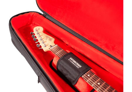 En el interior, la G-ICONELECTRIC cuenta con un forro de micro-velvet muy suave al tacto que protege el acabado de la guitarra frente a arañazos, junto con un bloque de apoyo para el mástil ajustable y desmontable mediante velcro. Este sistema de apoyo mantiene el mástil y la pala perfectamente alineados, reduciendo la tensión en el zoque y evitando movimientos bruscos. La zona del cuerpo está reforzada con un acolchado adicional que actúa como “colchón” ante impactos.