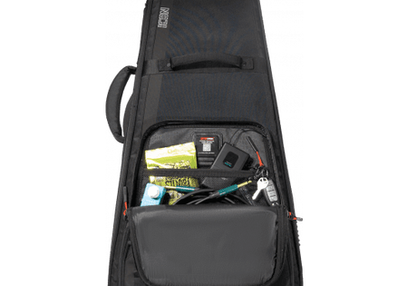 A nivel de transporte, la Gator G-ICONELECTRIC ofrece tres modos: correas tipo mochila ocultables para llevar la guitarra a la espalda, tres asas acolchadas reforzadas (frontal, trasera y lateral) con topes de goma para diferentes formas de agarre y un diseño equilibrado que facilita mover la guitarra en escenarios, aeropuertos, transporte público o coche. En la parte frontal dispone de un bolsillo exterior grande para cables, pedales compactos o partituras, y en la parte posterior integra un bolsillo oculto de acceso rápido para objetos de valor (documentación, móvil, cartera, etc.), además de otros compartimentos organizadores.