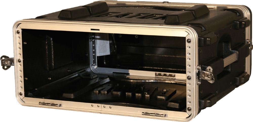 Su diseño inteligente incluye rieles de rack de acero de 7 mm zincado, tanto delanteros como traseros, que son roscados y reemplazables en caso de desgaste. Con una profundidad de rack de 19,25 pulgadas (48,9 cm), el GR-4L ofrece un espacio generoso para la mayoría de equipos estándar. Las tapas delantera y trasera, equipadas con una junta de estanqueidad para proteger del polvo y la humedad, son completamente extraíbles y se aseguran mediante cierres giratorios de alta resistencia (twist latches) que garantizan un cierre firme y seguro durante el transporte. Además, las tapas son con cerradura para una mayor seguridad de su valioso equipo.