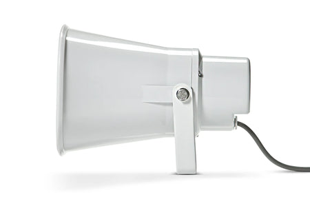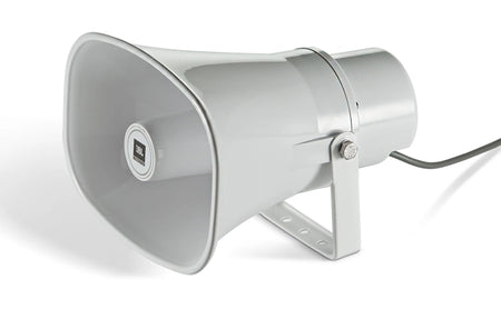 Bocina de megafonía JBL CSS-H15: potencia 15 W (60 W pico); cobertura 70° (H) × 90° (V); rango (-10 dB) 400 Hz–7,5 kHz; sensibilidad 105 dB (1 W/1 m, media 1–6 kHz); SPL máx. 123 dB cont. medio / 129 dB pico (1–6 kHz); filtro paso alto 350 Hz integrado; taps transformador 70 V: 15/7,5/3,8/1,9/0,9 W · 100 V: 15/7,5/3,8/1,9 W; bypass 8 Ω; driver de 33 mm con diafragma fenólico; materiales: ABS + soporte en U de acero inoxidable (3 orificios Ø 8,8 mm); color RAL9016; grado IP65; entrada por latiguillo 300 mm con prensaestopas (rojo + / negro −); dimensiones bocina 163 × 222 × 232 mm (Al × An × F), con soporte 181 × 222 × 232 mm; peso 1,36 kg.