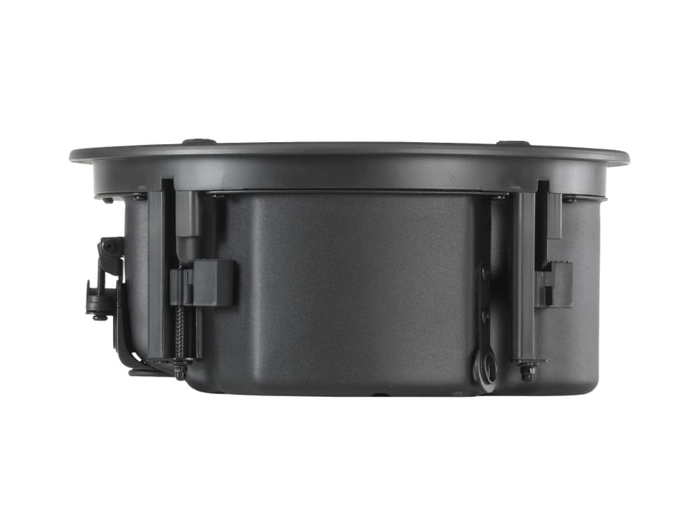 Altavoz de techo coaxial de 4 pulgadas (100 mm) con woofer de cono de papel tratado y tweeter de cúpula blanda de 19 mm. Diseño de perfil bajo con profundidad de montaje inferior a 100 mm. Impedancia nominal de 16 ohmios y transformador multi-tap para sistemas de 70V (30W, 15W, 7.5W) y 100V (30W, 15W). Respuesta en frecuencia de 75 Hz a 18 kHz. Cobertura cónica de 130°. Sensibilidad de 86 dB. Capacidad de potencia de 60W continuos (programa) y 240W pico. Incluye rejilla magnética sin marco, pintable. Dimensiones: 107 mm de altura x 253 mm de diámetro.