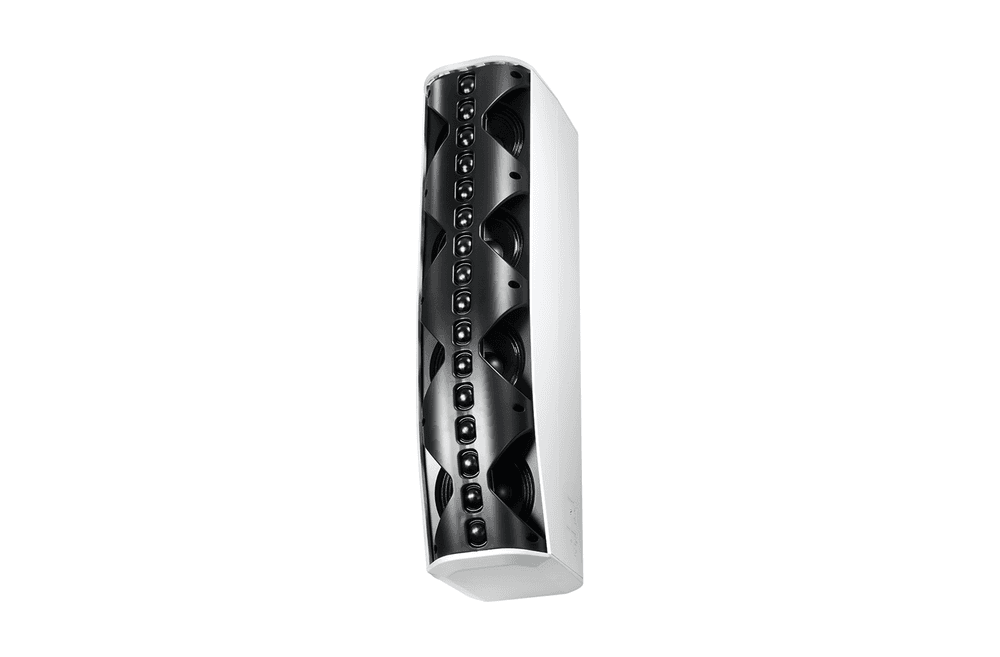 Altavoz de columna pasivo de dos vías con tecnología Constant Beamwidth Technology™ y diseño J-Array asimétrico. Incorpora cuatro drivers de baja frecuencia de 125 mm (5 pulgadas) y dieciséis drivers de alta frecuencia de cúpula blanda de 25 mm (1 pulgada). Ofrece una respuesta en frecuencia de 60 Hz a 20 kHz. El patrón de cobertura vertical es conmutable entre 45° y 25°, con una cobertura horizontal de 150°. La sensibilidad es de 90 dB SPL (1W, @1m). La impedancia nominal es de 8 ohmios. La potencia admisible es de 500W (programa continuo) y 2000W (pico). Dispone de modos de voicing conmutables (Music/Speech) y protección de sobrecarga SonicGuard™ para altas frecuencias. El recinto es de ABS reforzado con fibra de vidrio y rejilla de aluminio. Dimensiones: 694 x 170 x 237 mm. Peso: 9,5 kg. Incluye soporte de pared giratorio/inclinable.