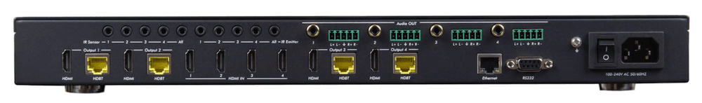 • Salidas de Vídeo (Matriz): 4x HDBaseT (RJ45), 4x HDMI Tipo A (Local Loop)