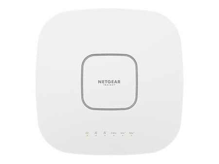 Punto de Acceso Inalámbrico Profesional WiFi 6 (802.11ax) con arquitectura Tri-Banda (2.4GHz, 5GHz Low, 5GHz High). Ofrece una tasa de transferencia agregada de hasta 6.0 Gbps (AX6000). Equipado con 1 puerto Ethernet 2.5 Gbps (Multi-Gig) con soporte PoE++ (802.3bt) para datos y alimentación, y 1 puerto Ethernet Gigabit adicional. Capacidad para soportar hasta 600 dispositivos clientes y 8 SSIDs por radio con soporte de VLAN. Gestión centralizada remota a través de plataforma Cloud Netgear Insight. Seguridad WPA3 Enterprise y autenticación 802.1x. Montaje en techo o pared incluido.