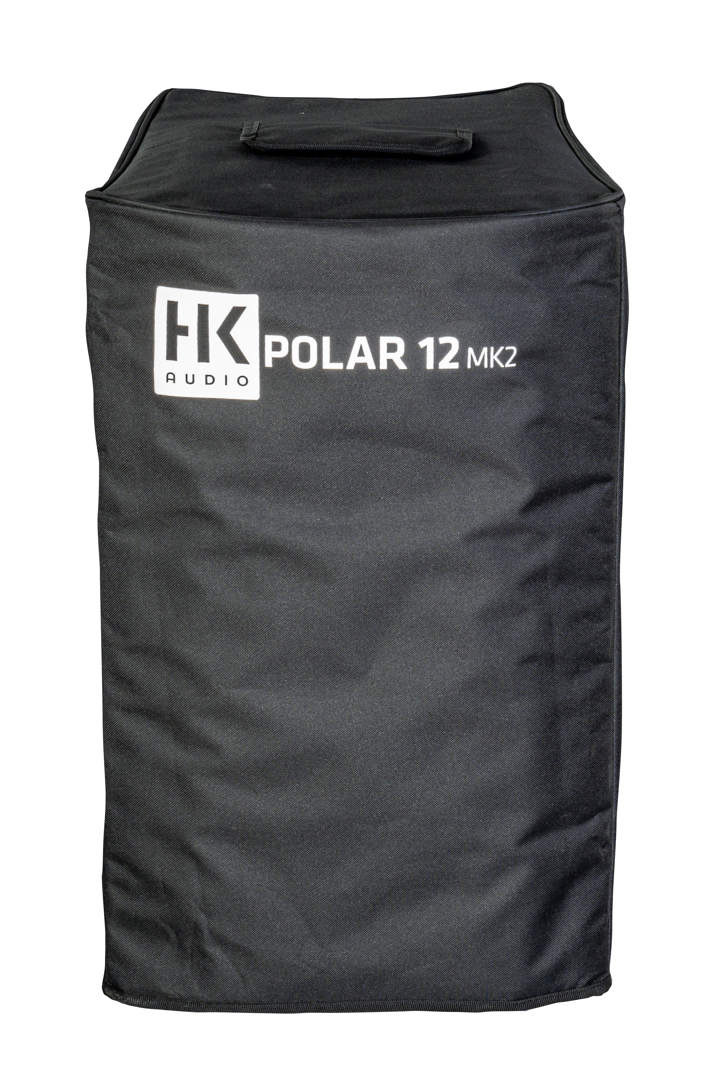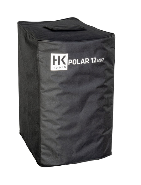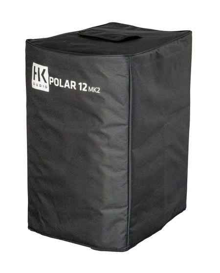 Funda protectora acolchada en nylon, color negro con logotipo en blanco, con apertura para acceder al asa del subgrave; compatibilidad: subwoofer del sistema HK Audio POLAR 12 MK2; colocación rápida; destinada a transporte y almacenamiento.