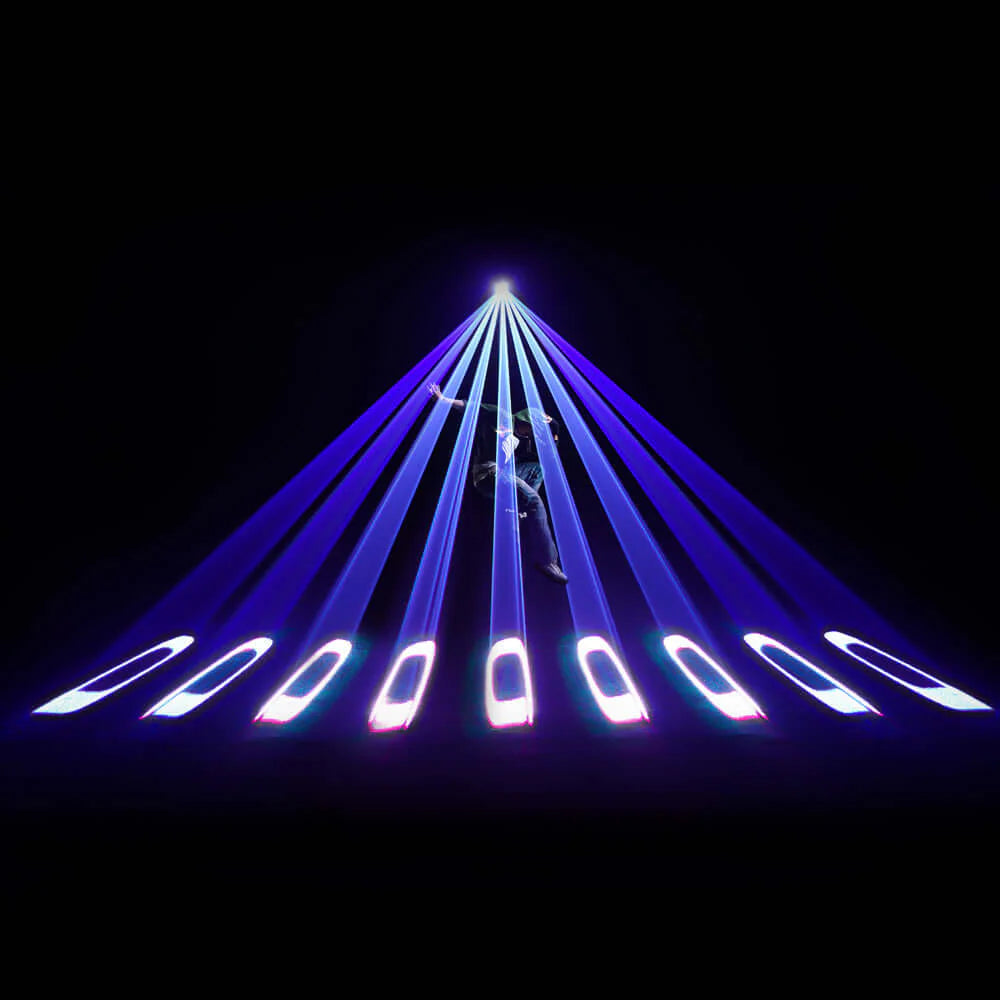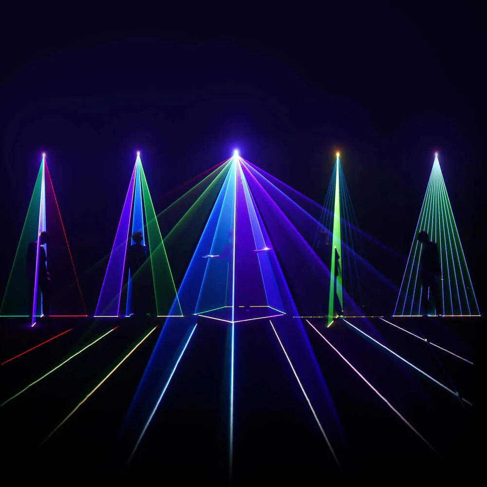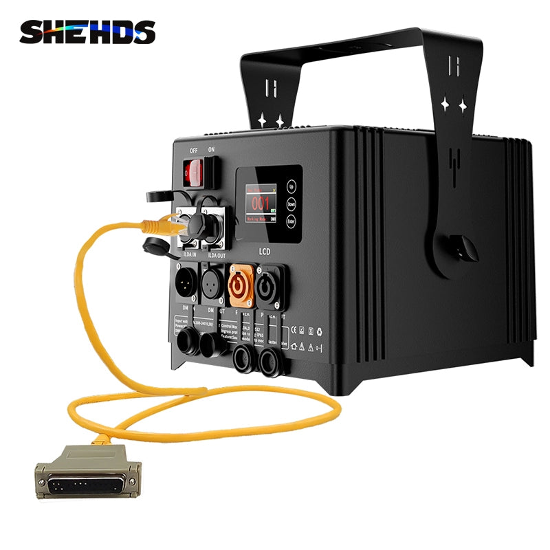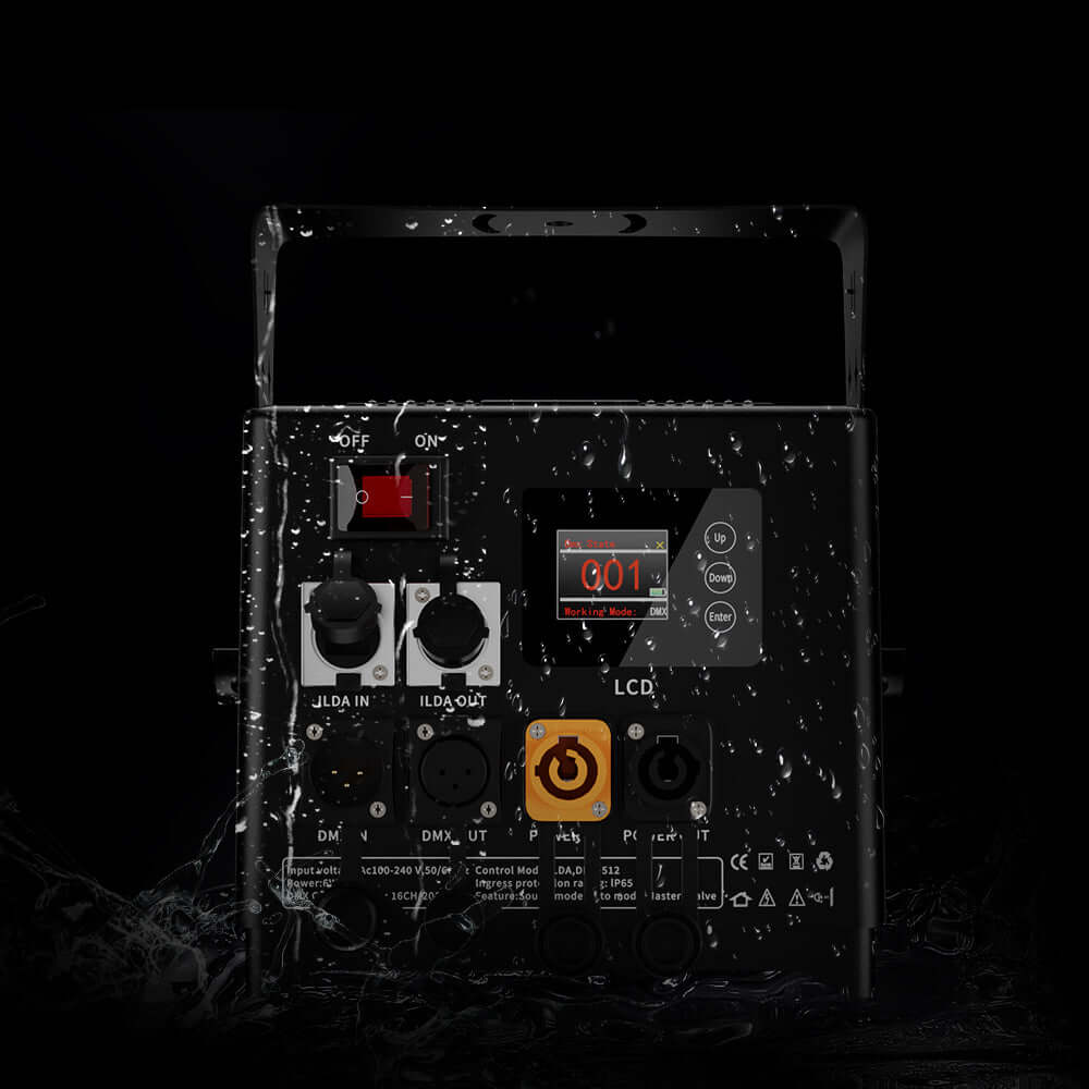 Compatible con control vía APP (iOS/Android), DMX512 (16/20 CH), ILDA sobre RJ45 y modos auto o sonido, permite programar patrones 3D/2D, animaciones y canopy estilo aurora a velocidades de escaneo de 25 kpps y ángulos ± 50° hasta 200 m de distancia (óptimo 20–50 m). La modulación analógica 0–5 V / TTL up to 25 kHz consigue efectos dinámicos y sincronizados con la música.