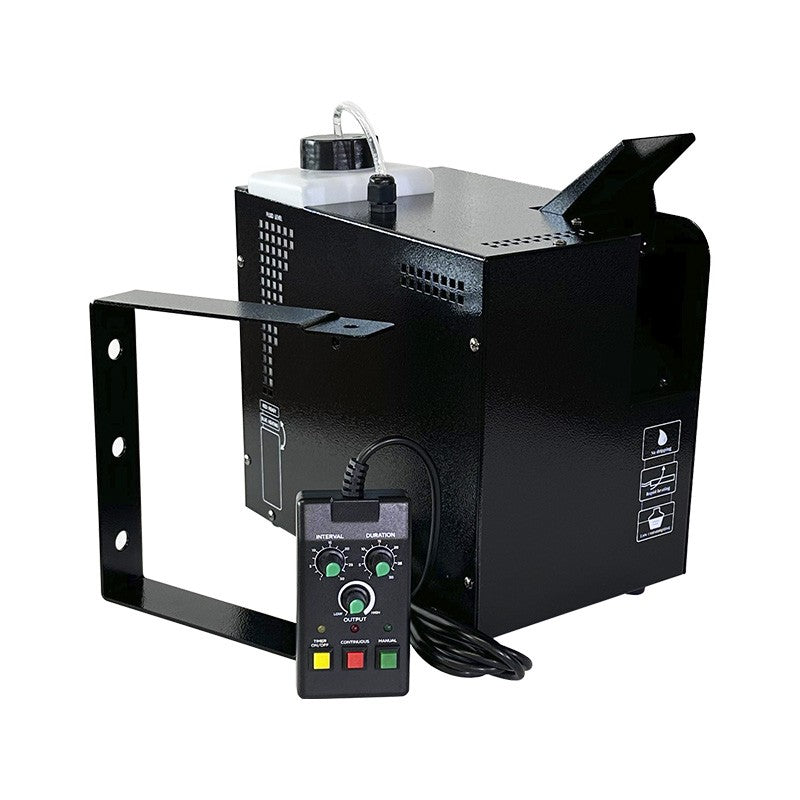 Ofrece un tiempo de calentamiento de 3 minutos y un caudal de ≈68 m³/min, con salida estable y ángulo de expulsión variable mediante accesorio móvil para dirigir el haze donde se necesita. Trabaja con unidad calefactora de 1000 W, depósito extraíble de 1,2 L y consumo de fluido de 1–22 ml/min. El control DMX de 2 canales (nivel de salida y ventilador) facilita la integración en cualquier rig de iluminación. Incluye control remoto temporizado por cable para uso autónomo.
