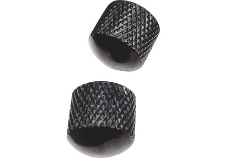 Juego de 2 botones de control para instrumentos electrónicos (guitarra/bajo) tipo Domo (Dome Knob). Fabricación en metal macizo con acabado negro y textura lateral estriada (knurled) para agarre antideslizante. Dimensiones compatibles con potenciómetros de eje métrico estándar de 6 mm. Sistema de fijación segura al eje mediante tornillo prisionero lateral. Diseño sin numeración ni inscripciones, apto para controles de volumen o tono indistintamente.