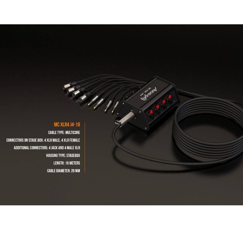 Multicore con cajetín de escenario 8 canales (4 XLR hembra + 4 TRS hembra); fan-out con 4 XLR macho + 4 TRS; longitud 10 m; cable balanceado 25 AWG (7×0,15); diámetro exterior 14 mm; dimensiones del conjunto 280 × 280 × 170 mm; peso 4,5 kg; color negro.