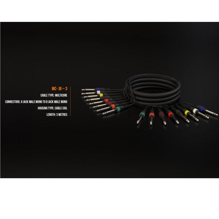 Cable multicore Audibax MC-J8-3: 8× jack mono macho a 8× jack mono macho, diseño coil, conductores OFC + cobre estañado, 3 m de longitud, 25 AWG (7×0,15), Ø exterior 14 mm, color negro; dimensiones de embalaje 200 × 200 × 60 mm, peso aprox. 1 kg.