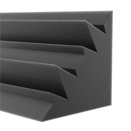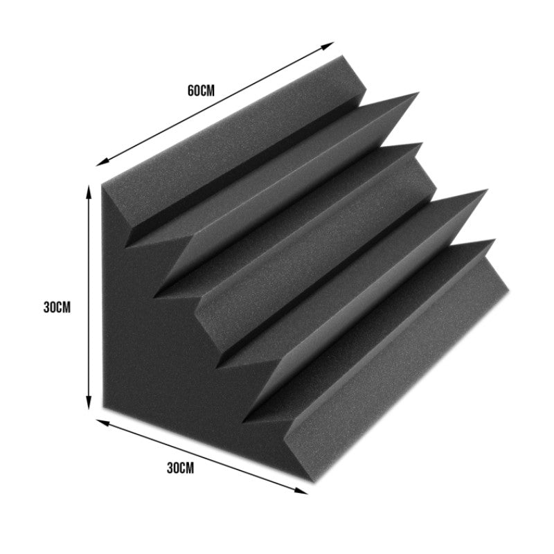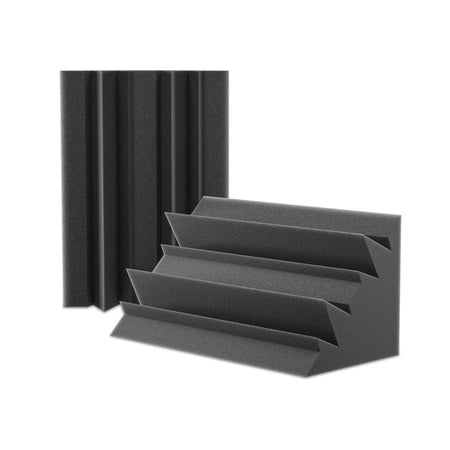 Trampas de graves de espuma de poliuretano, densidad 25,0 kg/m³ ±5 %, dimensiones 600 × 370 × 370 mm (alto × ancho × profundo), color gris, set de 2 piezas; adecuadas para absorción de bajas frecuencias en tratamiento acústico de salas.