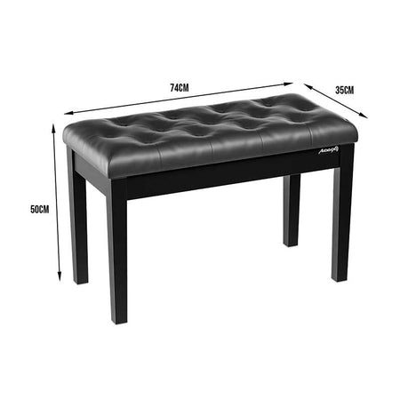 Banqueta doble para piano/teclado, modelo Audibax KB502, estructura en aluminio, asiento acolchado con piel sintética, compartimento bajo el asiento, patas con goma antideslizante, color negro, dimensiones 74 × 35 × 50 cm (ancho × profundo × alto), montaje sencillo con herramientas e instrucciones incluidas.