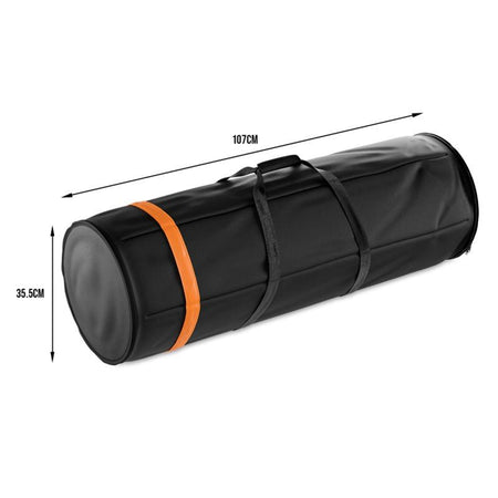 Funda de transporte en nylon para hasta 6 soportes de micrófono, acolchado 5 mm, asas ergonómicas, base y costuras reforzadas, color negro con interior y cremallera naranja; dimensiones 1070 × 350 × 350 mm.