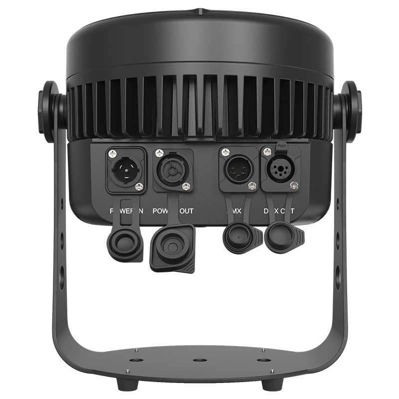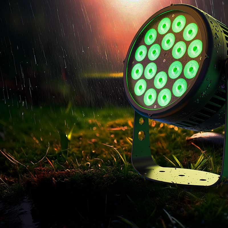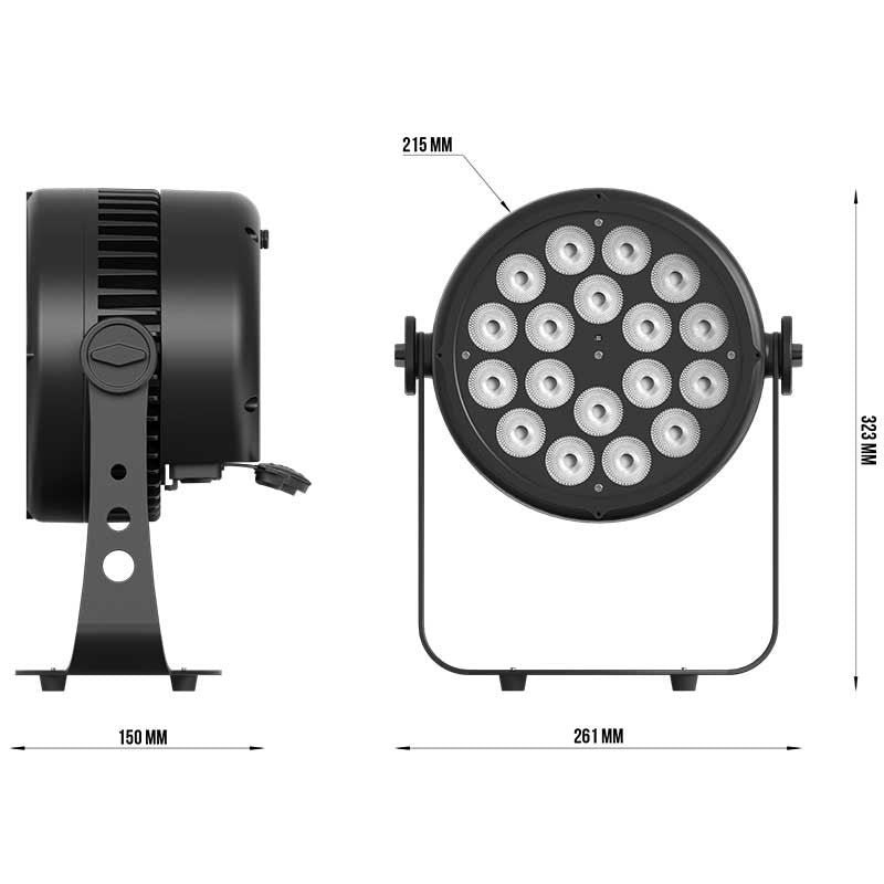 PAR LED IP65 18 × 10 W RGBWA+UV (6 en 1); óptica 45° (frost); control DMX-512 6/10 canales con RDM; dimmer 0–100 % con curvas lineal/exponencial/logarítmica/S-curve; estrobo; funcionamiento sin parpadeo; conectores XLR 5 pines IP65 y powerCON TRUE1 IP65 IN/OUT; alimentación AC 100–240 V 50/60 Hz, 130 W máx., PF 0,52, fusible 1 A; IP65, refrigeración por convección; dimensiones del equipo 267 × 234 × 215 mm, peso 5,2 kg; incluye mando IR, cable, lira y manual.