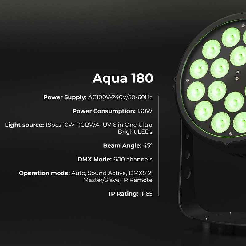 - Fuente de luz: 18 × 10 W RGBWA+UV (6 en 1), vida útil 50.000 h.