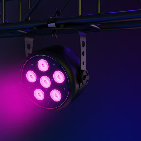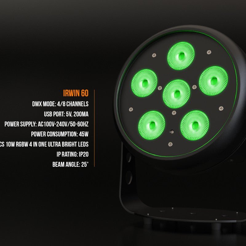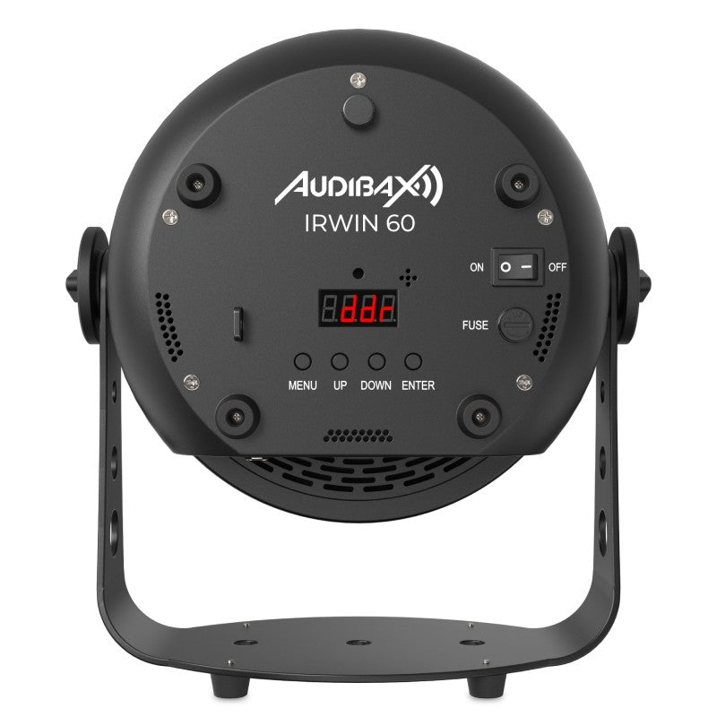 El Audibax Irwin 60 es un foco PAR LED compacto y fiable diseñado para aportar lavados de color uniformes y una mezcla RGBW precisa en eventos, escenarios, platós y espacios de ocio. Incorpora 6 LEDs de 10 W RGBW 4-en-1 (60 W totales) que producen colores intensos y limpios, con un ángulo de haz de 25° ideal para bañar paredes, fondos y elementos escénicos. Su control DMX512 (4 u 8 canales), los modos automático y por sonido, y el mando a distancia IR de serie permiten integrarlo en cualquier set con rapidez. Para facilitar montaje en giras e instalaciones, equipa conectores profesionales Seetronic PowerCON In/Out y XLR de 5 pines, además de pantalla LED de 4 botones para una configuración ágil. Con un consumo máximo de 45 W, clasificación IP20 y chasis ligero, el Irwin 60 equilibra potencia, control y eficiencia para un uso intensivo.