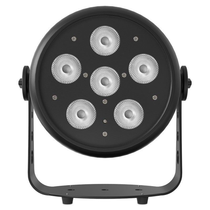 Foco PAR LED interior IP20 con 6 x 10 W RGBW 4-en-1 (60 W totales), haz 25°, control DMX512 4/8 canales, modos Auto/Sonido/Maestro-Esclavo/IR, pantalla LED 4 botones, consumo 45 W, alimentación AC 100–240 V 50/60 Hz, conectores Seetronic PowerCON In/Out y XLR 5 pines, puerto USB 5 V 200 mA, dimensiones 268 x 246 x 137 mm, peso 1,84 kg. Incluye mando IR, cable de alimentación y manual.