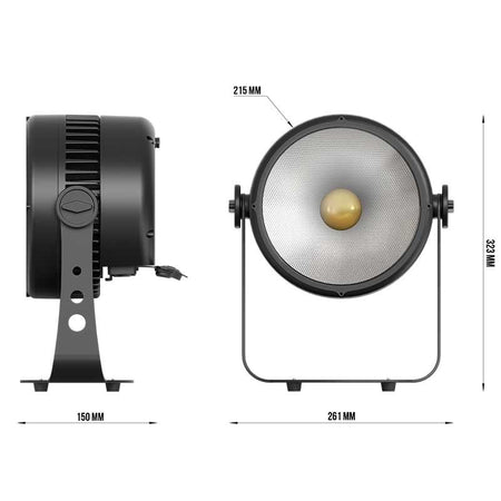 Proyector PAR LED COB RGBA 200 W, haz 60° (lente Fresnel); control DMX-512 4/8 canales y RDM; dimmer 0–100 % con curvas lineal/exponencial/logarítmica/S-curve; estrobo; IP65; conectores XLR 5 pines IP65 y PowerCON True IP65 IN/OUT (REAN by Neutrik); alimentación AC 100–240 V 50/60 Hz, 150 W, FP 0,44; refrigeración por convección; −20…+45 °C; dimensiones 323 × 261 × 150 mm, peso 5,1 kg; incluye lira, cable de alimentación y manual.