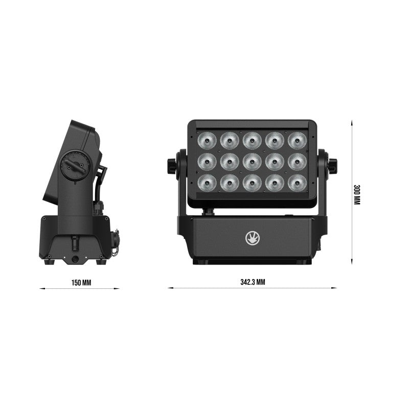 Washer LED con batería IP65 de 15 × 20 W RGBL; 10° (lente PMMA 45 mm); CCT 2.500–10.000 K; dimmer 0–100 % (curvas Lineal/EXP/S/LOG); PWM 2,4/4,8/9,6/15 kHz; control DMX512/RDM por XLR 5 pines, W-DMX y CRMX (opcional); modos 6/9/10 ch; fanless; conectores REAN XLR y PowerCON TRUE1; alimentación 21 V (consumo máx. versión batería 140 W); autonomía aprox. 4/6/8 h (Full/Med/Eco, RGB); cuerpo de aluminio; dimensiones del equipo 342 × 147 × 288 mm (L × An × Al); peso 8 kg; temperatura de trabajo −15 °C a +45 °C. Accesorios: barndoors, difusores 30° y 60×10°, batería extra, holder y flightcase con carga.