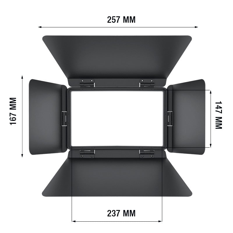 Visera de control de haz tipo Barndoor de 4 palas, modelo AW300-001, compatible exclusivamente con el proyector LED Triton Blue Hydro W300. Estructura fabricada en metal con palas de aluminio ajustables individualmente. Acabado en color negro mate para minimizar la reflexión. Dimensiones de 257 x 167 mm. Diseñada para modelar el haz de luz y limitar el derrame lumínico en aplicaciones profesionales.